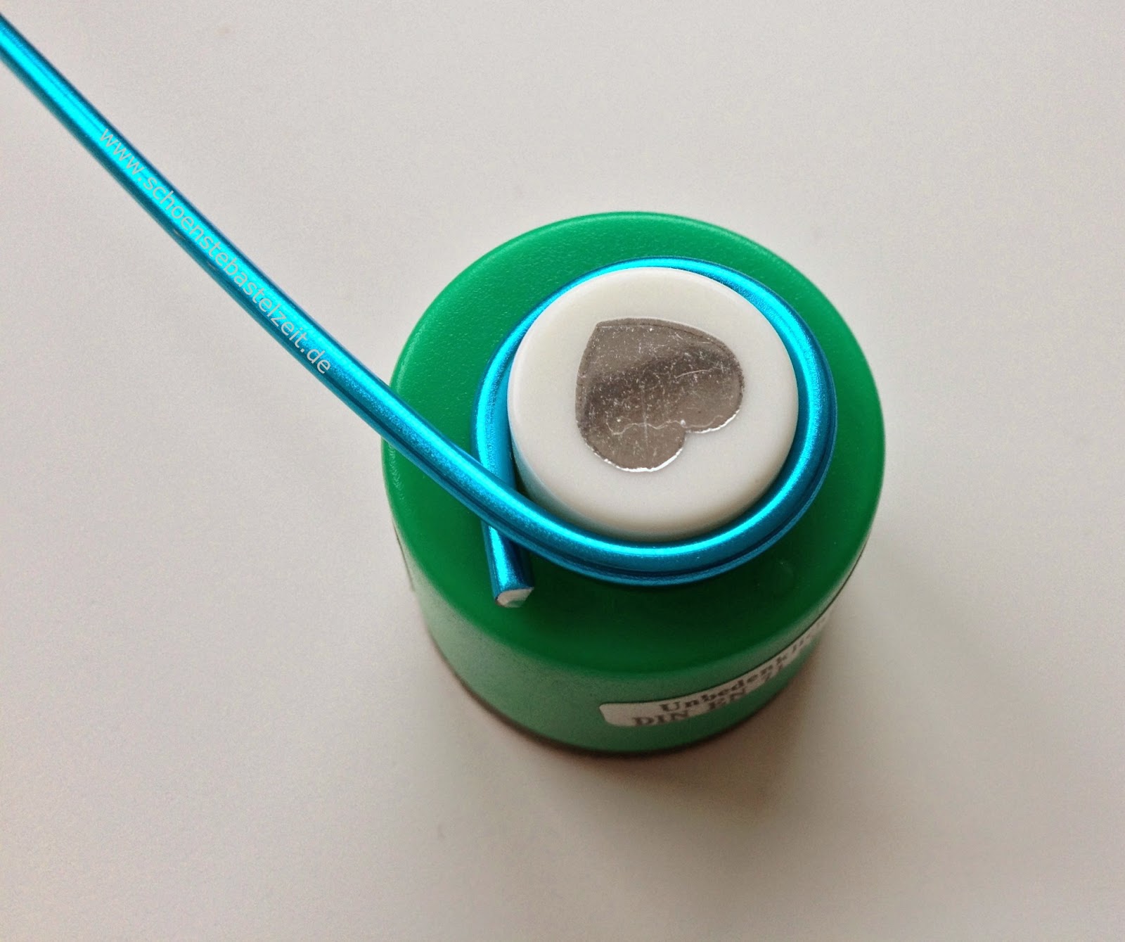 Damit der Heiligenschein schön rund wird, suche ich mir immer ein Hilfsmittel, um das ich den Aludraht legen und ausformen kann – in diesem Fall ist das mein Mini-Herzstanzer.
