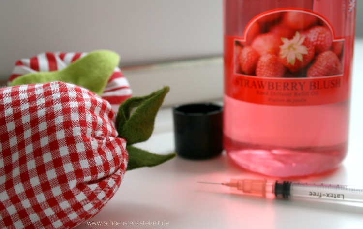 Ich nehme dafür den „Strawberry Blush“-Raumduft Und: eine kleine Spritze, die ihr in jeder Apotheke bekommt. Einfach die Spritze mit dem Raumduft vollziehen, und in kleinen Dosen in die mit Füllwatte ausgestopften Früchte füllen.