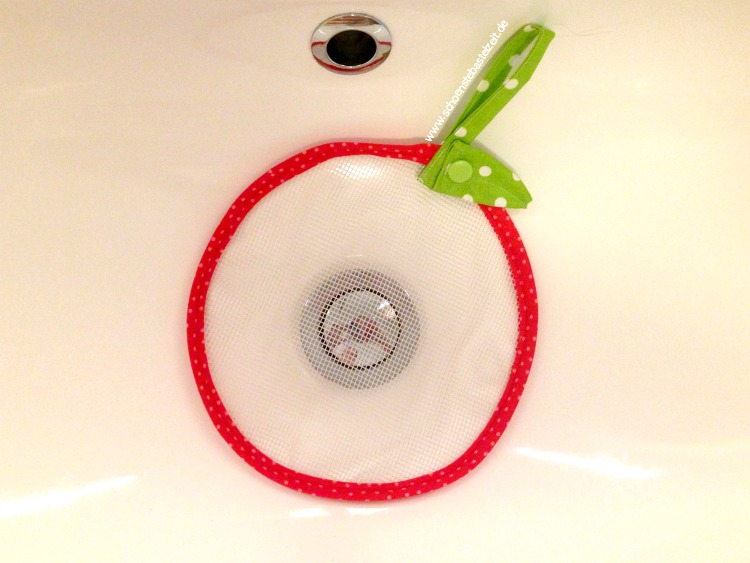 Die runde Form hat den Vorteil, dass sich der Kontaktlinsenrettungsapfel jedem Waschbecken anpasst. Egal, ob es quadratisch, oval oder rund ist – man legt es einfach auf den Abguss, das Schrägband ist schwer genug, dass es auf dem Porzellan aufliegt, und somit landen Kontaktlinsen, die einem beim Ein- oder Herausnehmen davon flutschen, nicht im Ausguss, sondern im Apfelnetz. Denn vor allem auf Reisen kommt es mal vor – so habe ich mir als Nicht-Kontaktlinsenträgerin sagen lassen – dass da mal kein Stöpsel im Ausguss ist, oder er so weit heraussteht, dass da locker eine Linse drunter durch flutscht…