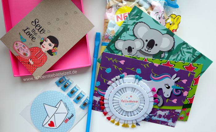 …und das erste Mal staunen: ein toller Aufkleber von Cherrypicking, ein paar Wonderclips, ein Markierstift in blau, Herzchen-Stecknadeln, tolle Postkarten von Stoff&Liebe und eine große Portion Eis! Die Dinger duften sogar durch die Tüte, ehrlich!