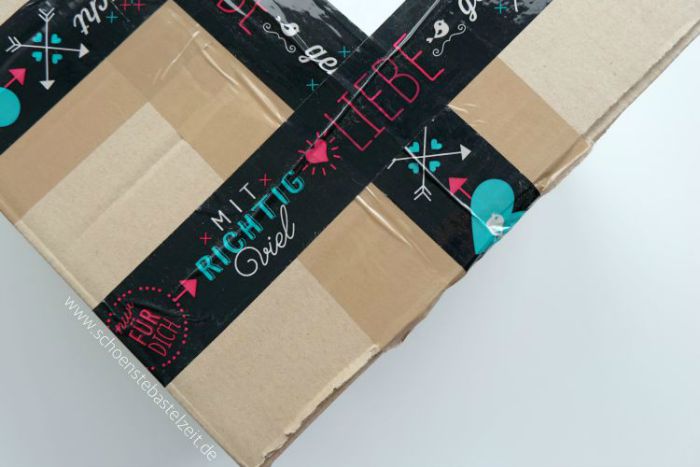 Aber jetzt geht’s los, es wird ausgepackt: Paketband weg – und der erste Blick ins Paket! Was für ein tolles Geschenkpapier. Sterne in Neonpink auf Packpapier! Grandios, oder? Erst mal die tolle Jolijou-Karte und die schöne Box schnappen…
