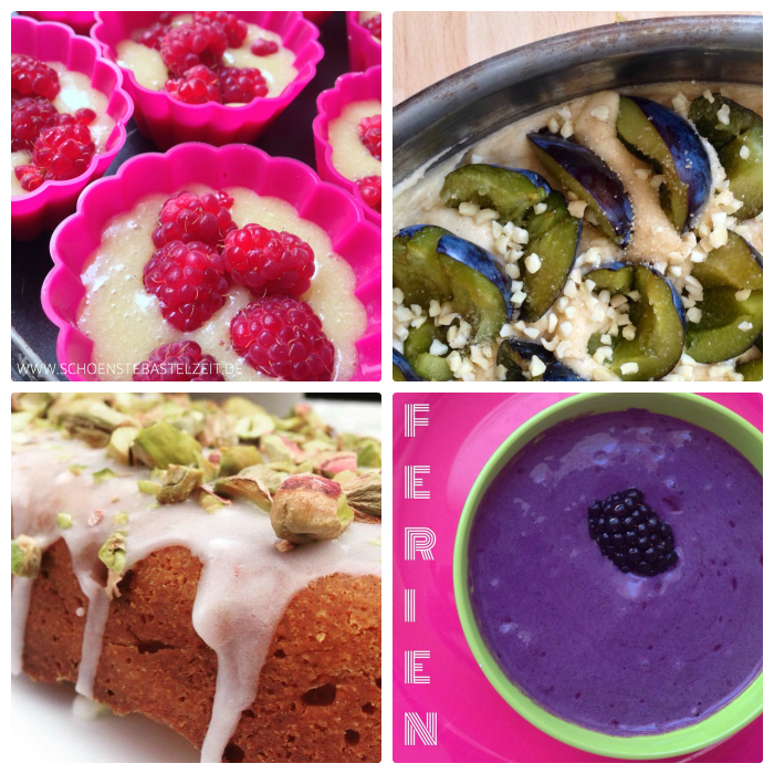 | Die Wochenenden versüßt: 1) Schnelle Himbeer-Friands nach einem Rezept von Zucker, Zimt und Liebe. 2) Der erste Zwetschgenkuchen der Saison 3) Auch ohne Backpulver lecker: der Zitronen-Mascarpone-Kuchen mit Pistazien-Topping 4) Krasse Farbe: homemade Brombeerjoghurt |