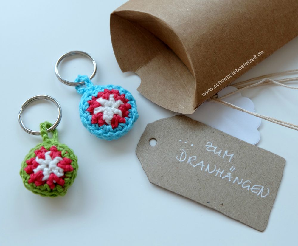 Dann ging es mit Häkeleien weiter: Diese hatte sich Kristina nämlich gewünscht in ihrem Fragebogen. Passend zum Farbmotto des Täschchens sind zwei Schlüsselanhänger entstanden. Diese kleinen Anhänger, Taschenbaumler oder auch Reißverschluss-Verlängerer häkele ich immer wieder gerne – aus einem einfachen Grund: Sie bestehen aus drei Farben, aber man muss nur einen Faden vernähen! 😉