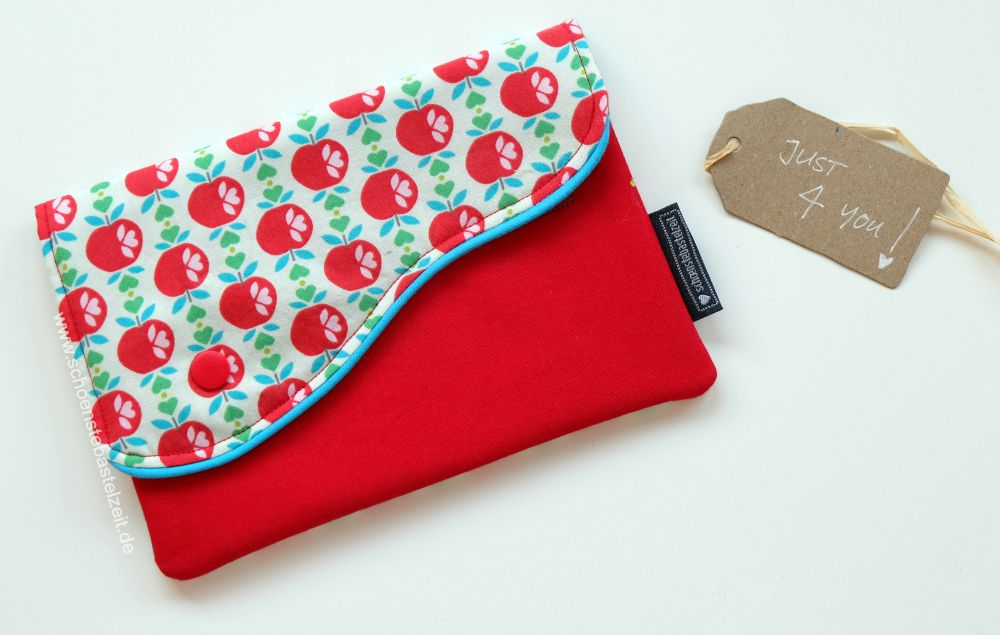 Rot. Türkis. Apfelgrün – Lieblingsfarben von Kristina. Alle drei Farben sind im schönen Apfelstoff von Jolijou vereint. Somit stand die Stoffauswahl schnell fest. Genäht habe das GonJo-Täschchen aus der Feder von mipamias.