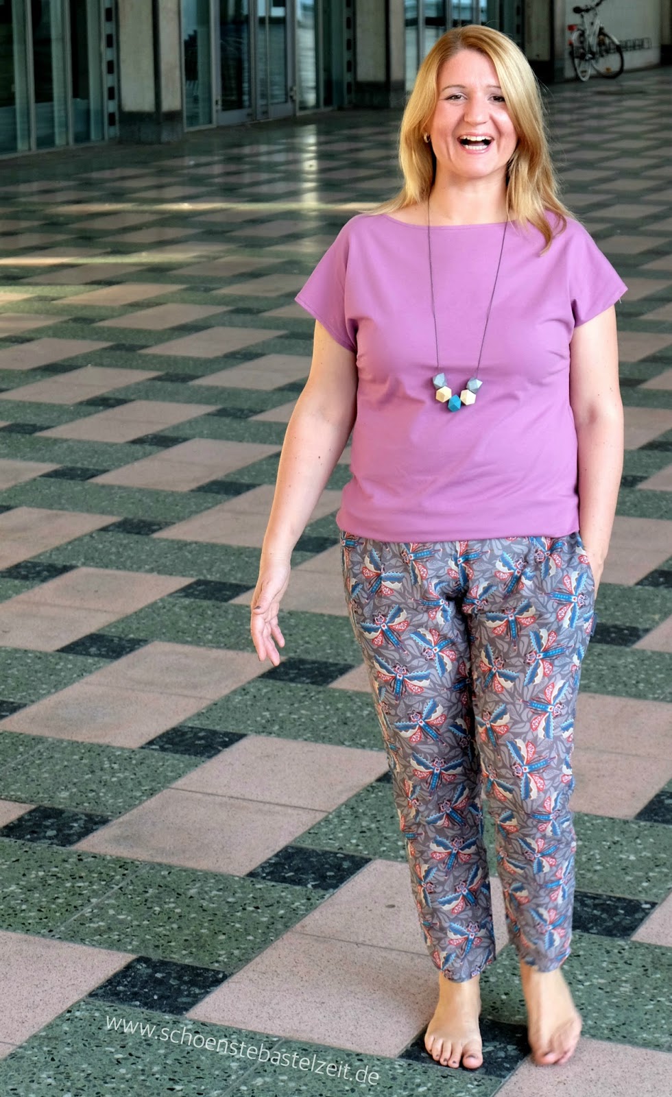 Für den Nähbloggerinnen-Katalog hab ich mich bewusst für ein Outfit entschieden, das ich genauso auch im Laden gekauft hätte: eine lässige Sommerhose, dazu ein Oberteil in uni. Wobei mich „uni“ in diesem Fall wirklich vor eine schwere Entscheidung gestellt hat. Und allen Ratschlägen zum Trotz ist es für den Katalog nun doch das Oberteil in Flieder geworden. Aus einem einfachen Grund: Wäre ich shoppen gewesen, hätte ich Flieder gekauft!