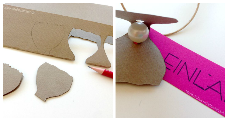- Papierkordel durch das eine Muschelloch ziehen. Perle auffädeln. Papierkordel durch das gegenüberliegen Loch auf der andere Muschelseite hinaus führen. Fertig ist der Muschelanhänger.