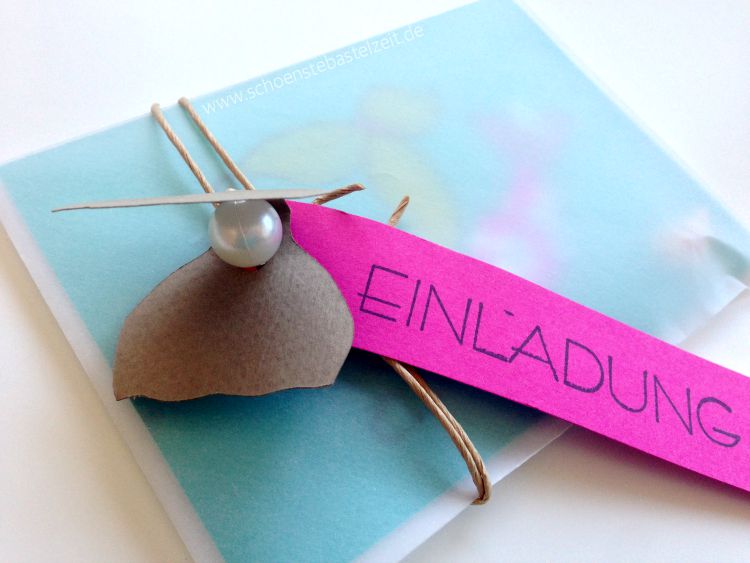 - Einlegeblatt in die Karte stecken, das Ganze gemeinsam in den Umschlag. Mit einem Aufkleber oder etwas Klebeband verzieren. Mit dem Einladung-Muschel-Bändchen verzieren. Fertig. Ab damit in die Briefkästen der kleinen Meerjungfrauen-Freunde.