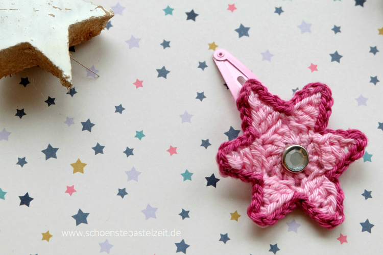 Was das Fixieren der Sterne auf dem Spängchen-Rohling angeht, habe ich übrigens die besten Erfahrungen mit Textilkleber gemacht. Ich hätte ja auf Heißklebepistole getippt – aber da fallen bei uns die Sterne ratzfatz vom Spängchen. Keine gute Lösung. Solltet ihr die Sternen-Spängchen für ganz kleine Fräuleins häkeln, dann lasst vielleicht auch die Glitzer-Niete weg. Sie lässt sich zwar mit den kleinen Nietenzähnchen recht gut im Häkelstern verankern, aber dennoch bekommen kleine Mädchenhände die sicherlich schneller weggepult als einem lieb ist.