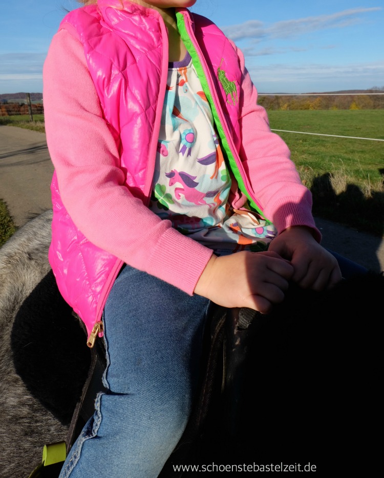 Wir sind beide immer wieder erstaunt, mit welcher Selbstverständlichkeit sich das kleine Fräulein in den Sattel schwingt. Von mir hat sie das nicht. Ich erinnere mich noch, dass man mich brüllend von einem Pferderücken runterholen musste, weil mir das Ganze zu wackelig und zu hoch war. Mir sind Pferde auf Stoff eindeutig lieber.