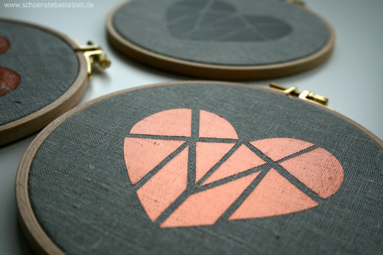 Man braucht dafür lediglich Stickrahmen, etwas graues Leinen und Flexfolie zum Aufbügeln. Und nein, ihr müsst dafür nicht extra im Besitz eines Plotters sein. Denn das Herz könnt ihr auch einfach mit einer Schere aus der Flexfolie schneiden. Dann mithilfe eine Geo-Dreiecks das Muster auf die Rückseite zeichnen, zerschnippeln – und mit wenig Abstand die Einzelteile auf den Stoff bügeln. Das Ganze in den Stickrahmen spannen. Und fertig ist das Mitbringsel, dem man auf den ersten Blick ansieht, dass es von Herzen kommt.