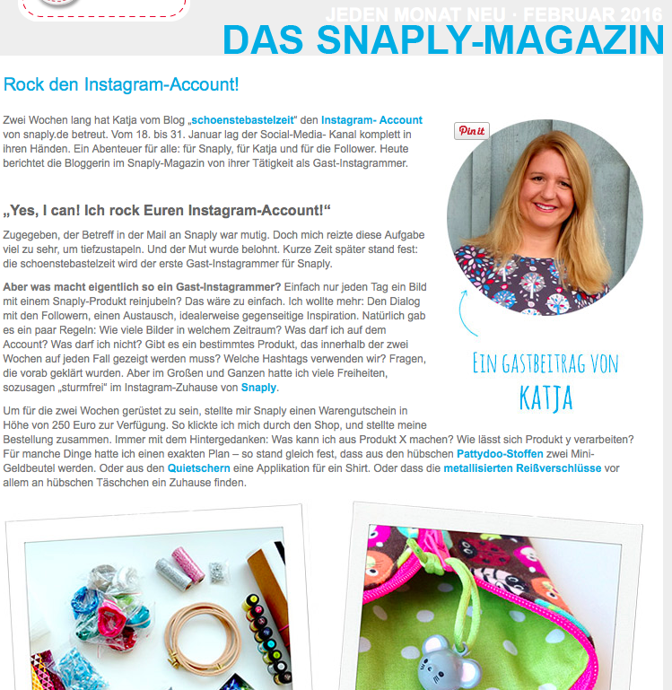 Wenn eine Zeitung am frühen Morgen druckfrisch ist, was ist dann ein Online-Magazin direkt nach Erscheinen? Klickfrisch? Die Frage ist durchaus eine Überlegung wert. Aber was ich eigentlich damit sagen will: Das neue Snaply-Magazin ist da. Bereit zum klicken, bereit zum entdecken, bereit zum schmökern. Mit dabei: ein Artikel von schoenstebastelzeit.
