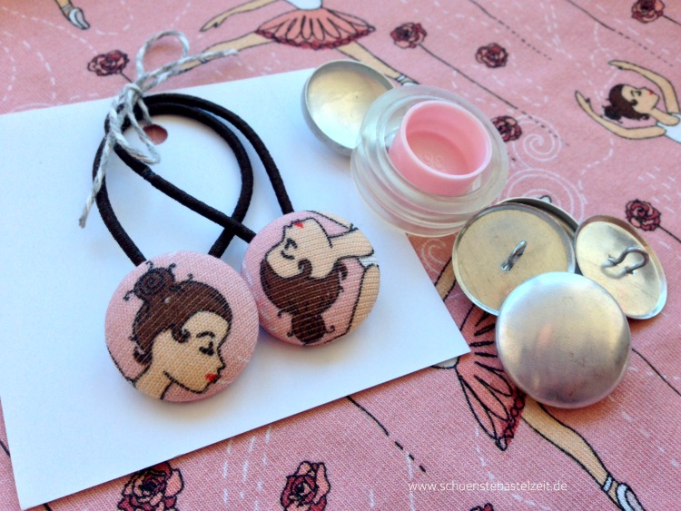 Jedes Reste-Fitzelchen von diesem schönen Jersey habe ich aufgehoben – und unter anderem noch ein paar Haargummis draus gebastelt. Mit beziehbaren Knöpfen und unifarbenen Haargummis ein echtes Ratz-Fatz-Projekt.