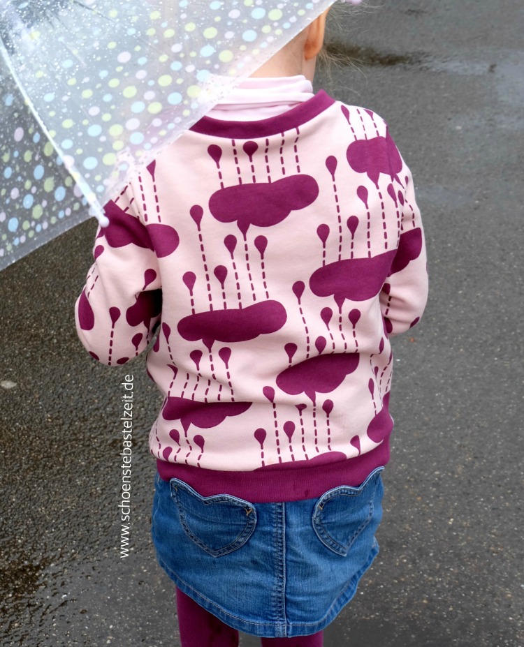 Ich hab zugeschnitten. Ich hab genäht. Und mich dabei noch gefreut, dass die Regenlinien an den Taschen aufeinander treffen. Tschakka! ABER: Ich hab partout nicht gesehen, dass die Wolken auf dem Kopf stehen!
