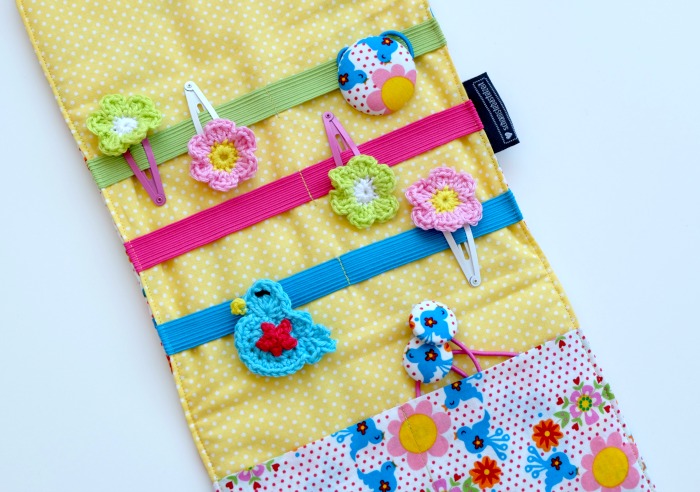 Mein Spängchen-Etui kommt natürlich nicht leer daher: Ich habe meine Häkelnadeln ausgepackt, und passend zum Etui ein paar Spängchen und eine Piepmatz-Brosche gehäkelt. Ebenso mit drin: Haargummis – einmal in groß und zweimal in klein, gefertigt aus demselben Stoff wie das Etui selbst, dem „pigeon wonder“ von Zwergenschön.
