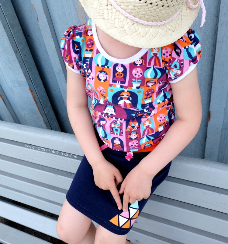 „princess castle“ heißt der fröhlich bunte Lillestoff, den ich als Grundlage genommen habe. Das Design gibt es schon seit einiger Zeit – und ursprünglich wollte ich daraus mal ein Kleid nähen. Das Projekt hing jetzt aber so lange in der Warteschleife, dass mein gebunkerter Meter dafür nicht mehr ausreichte. Also hab ich mal wieder den Lieblingshirt-Schnitt „Lina“ hervor gekramt, in neuer Größe abgepaust – und drauf los genäht. Was dabei nicht fehlen darf: die Puffärmelchen.