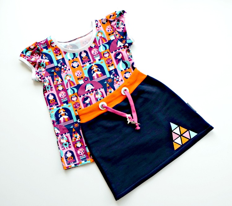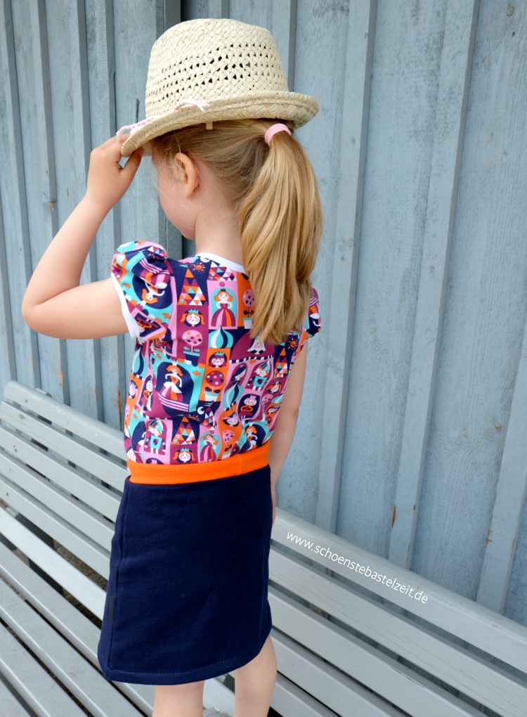Dazu gab’s einen recht schlicht gehaltenen und gemütlichen Rock: dunkelblauer Sweat, ein Bündchen in orange und eine Kordel in pink – fertig ist das Kombi-Teilchen. Okay, zwei Spielereien konnte ich mir nicht verkneifen…