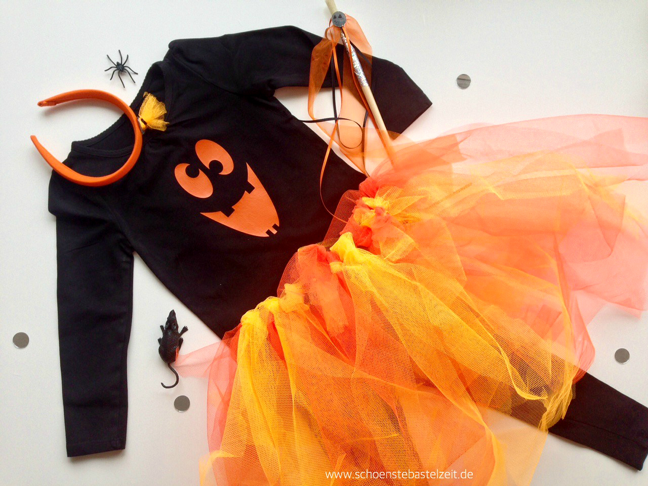 Kürbisfee – so lautet auch dieses Jahr der Kostümwunsch des kleinen Fräuleins. Wird für mich also eine ziemlich einfache Kiste: Ich nehme den Tüllrock, den ich ihr letztes Jahr nach einem Tutorial von HamburgerLiebe geknotet habe, und beplotte ein neues T-Shirt mit einem der Fratzen-Freebies von Anja von rapantinchen. Einfach, aber wow! Oder?