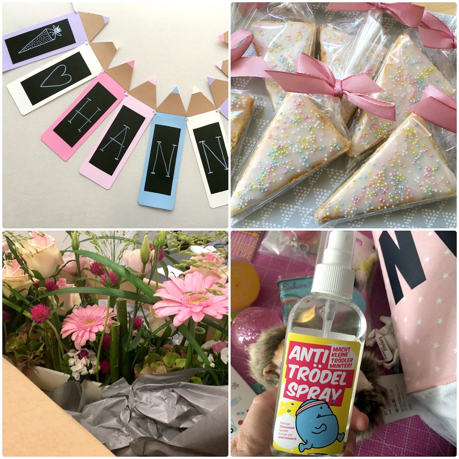 | 9) Endspurt: Schnell noch die Wand-Deko für morgen fertig machen. 10) Kleine Gast-Geschenke: Süße Schultüten in Form leckerer Hindbaersnitter, das feine Gebäck haben wir auf dem Weg nach Norwegen in Dänemark gegessen, und seither stand fest: Die gibt’s an der Einschulung! Das Rezept ist von meiner lieben Bloggerfreundin Katharina —> HIER! geht’s direkt zum Rezept. 11) Nicht selbst gemacht, sondern selbst gekauft: Denn Blumendeko kann ich nicht. 12) Packen für die Schultüte: dieses Spray sollte ich mir wohl mal selbst schenken… |