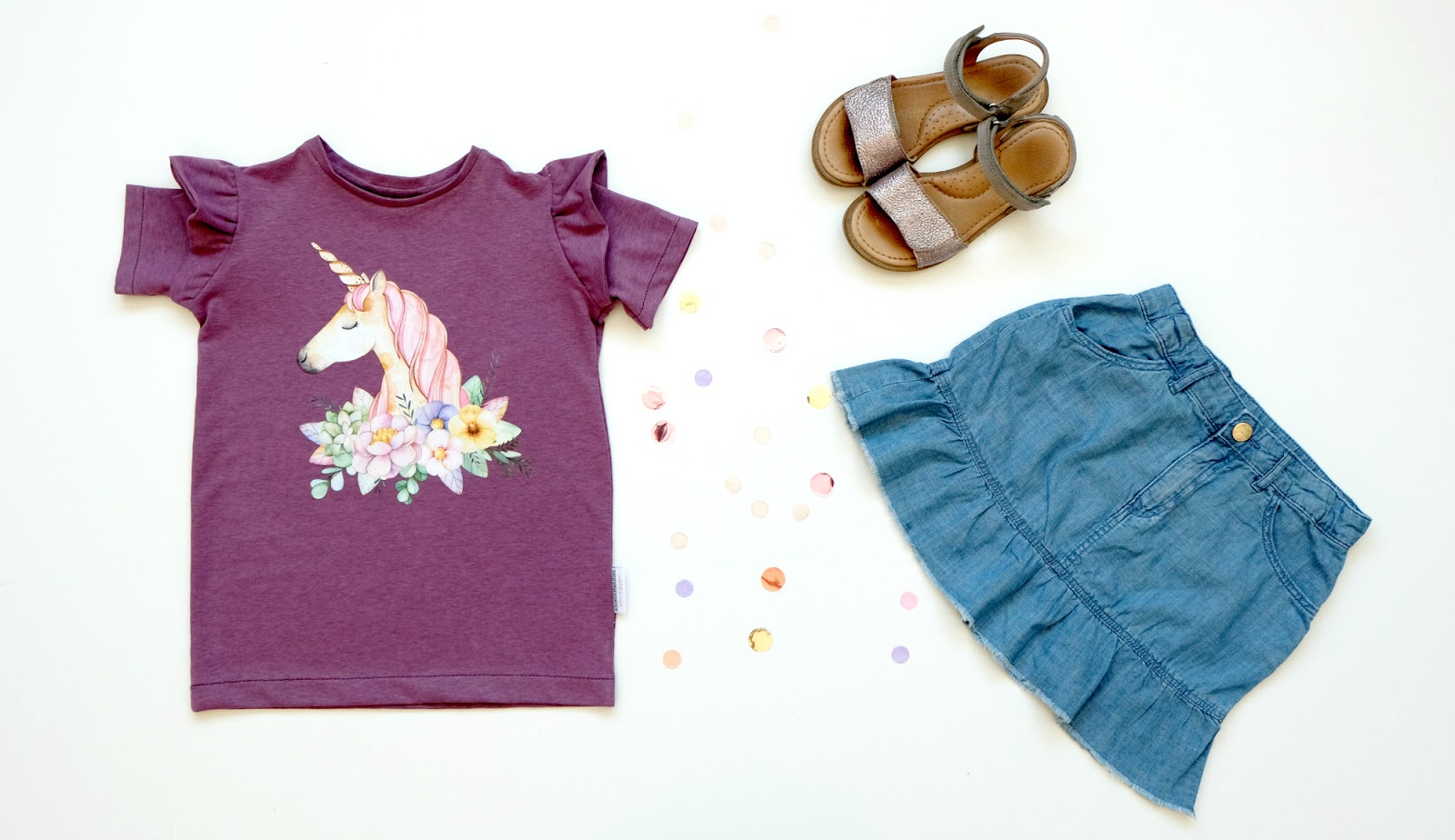 Finale bei der Shirtwoche auf schoenstebastelzeit! Sechs Tage, sechs Schnitte – und schon ist er sommerfit, der Kleiderschrank des Fräuleins. Zum heutigen Finaltag hab ich noch einmal ein richtiges Mädchenteil mitgebracht – mit Einhorn und Rüschen. Das Einhorn ist natürlich optional. Die Rüschen allerdings, die gehören fest zum Hemlock Top.